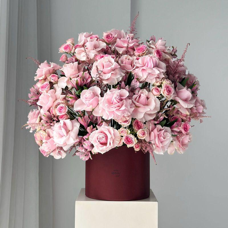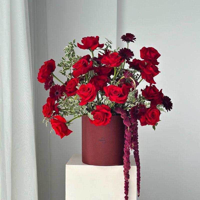 Maroon Leather Vase FRESH FLOWERS IF ANY TYPE IS NOT AVAILABLE, WE MIGHT CHANGE Approx: H: 60 cm - W: 70 cm