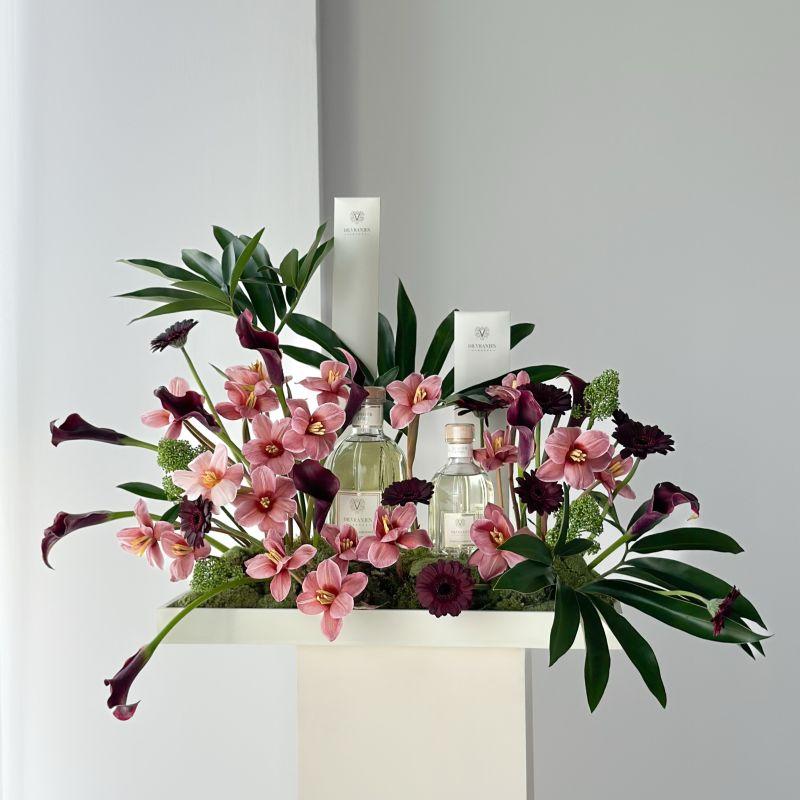 wooden tray Fresh Flowers Dr Vranjes diffuser or candle from your choice Flowers might be changed upon availability